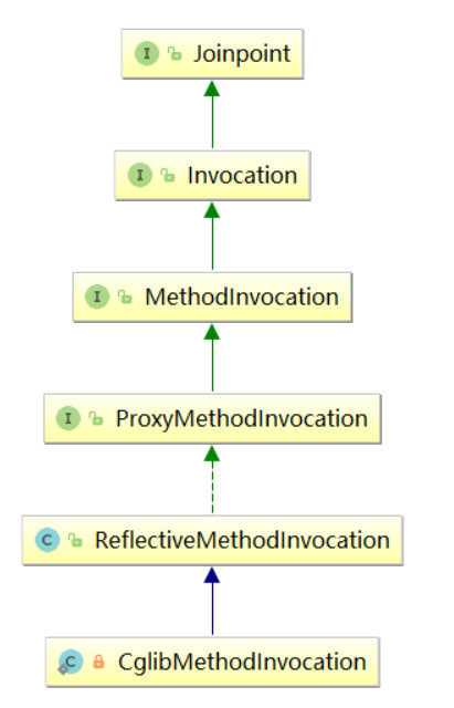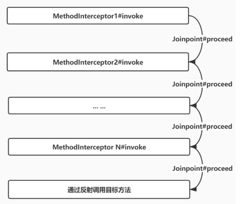 功能和上面的类似,当代理对象是采用cglib创建的,通过代理对象来访问目标对象的方法的时,最终过程是由CglibMethodInvocation来处理的,内部会通过递归调用方法拦截器,最终会调用到目标方法。