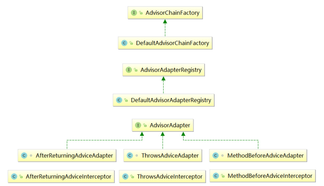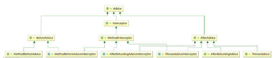 方法拦截器,所有的通知均需要转换为MethodInterceptor类型的,最终多个MethodInterceptor组成一个方法拦截器链。
