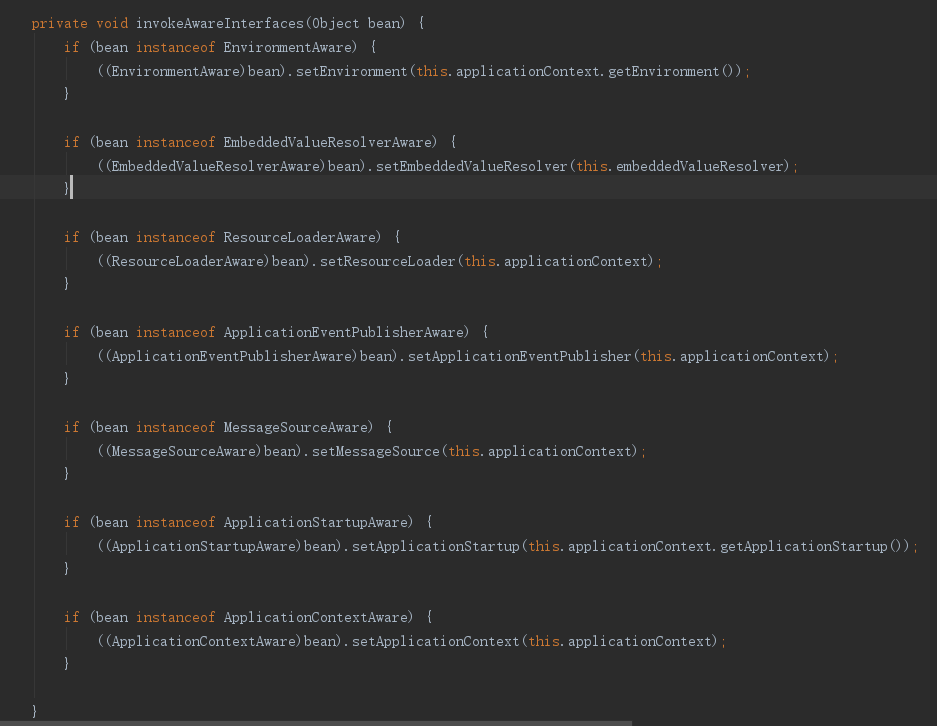 可以看到,该类用于执行各种驱动接口,在bean实例化之后,属性填充之后,通过执行以上红框标出的扩展接口,来获取对应容器的变量。所以这里应该来说是有6个扩展点,这里就放一起来说了