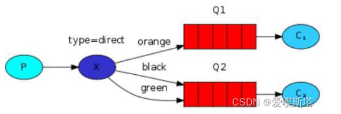 在这种场景下,一个消息在发布时指定了路由键为orange将会只被路由到队列Q1;