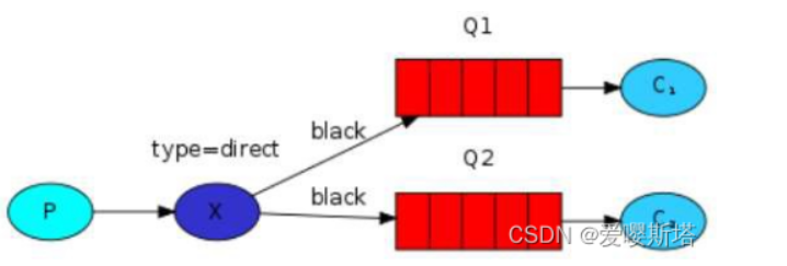 一个携带Routing key为black的消息,被Exchange同时推送到了队列Q1和Q2中。