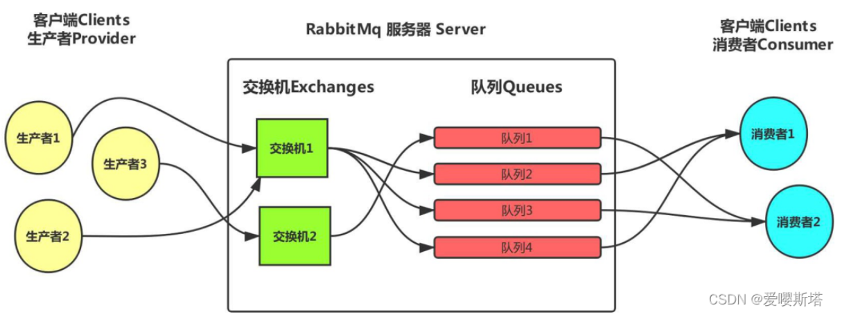 盗用其他博主的一个架构图: Broker: 中间件本身。接收和分发消息的应用,这里指的就是RabbitMQ Server。