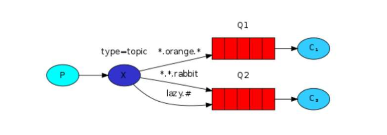 routing key quick.orange.rabbit-> queue Ql, Q2 routing key lazy.orange.elephant-> queue Ql,Q2