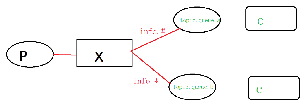 生产者发送消息道topic交换机上面,队列A和队列B绑定一个topoc交换机,对于队列a来说,它绑定的key为info.#,对于队列b来说,它绑定的key为info.*。