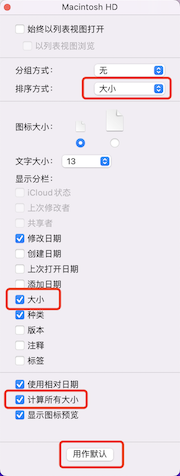 点击菜单栏「显示」-「查看显示选项」,排序方式选「大小」,勾选「大小」和「计算所有大小」,然后点击「用作默认」;
