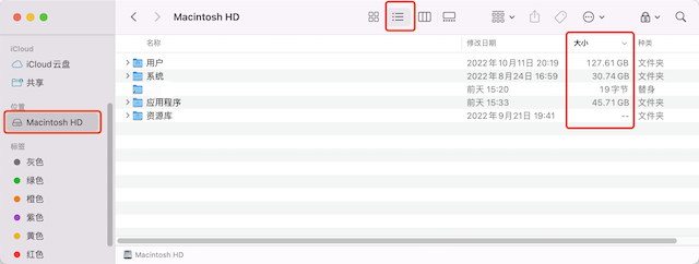 点击访达边栏的 Machintosh HD,切换到列表视图,并按「大小」倒序排列;
